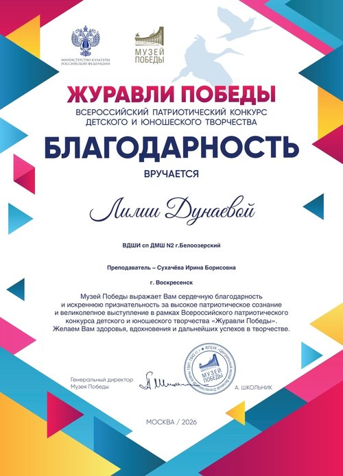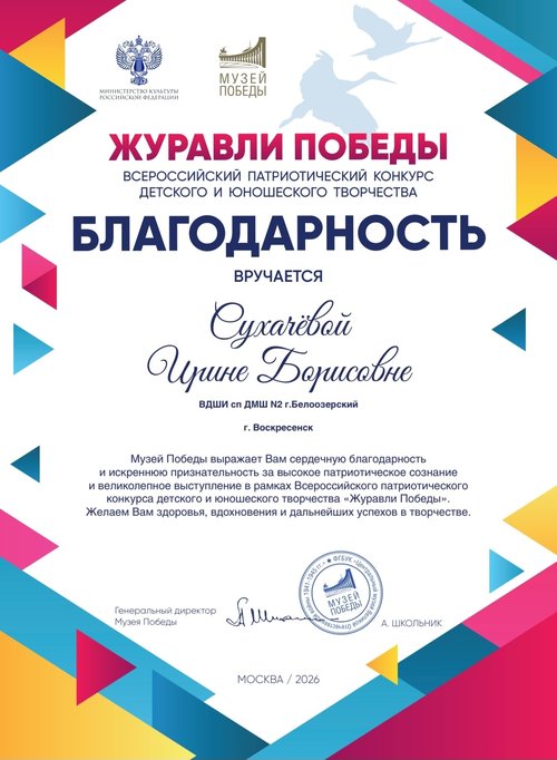 Благодарность за выступление в музее Победы в рамках Всероссийского патриотического конкурса "Журавли победы"