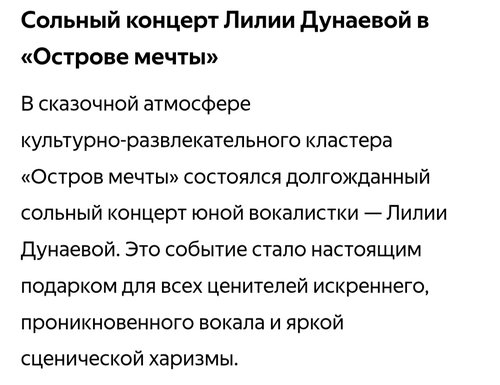 В сказочной атмосфере тематического парка развлечений «Остров мечты» состоялся долгожданный сольный концерт юной артистки — Лилии Дунаевой.