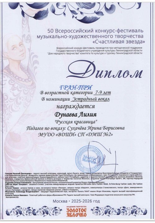Педагог Лилии 💗 Ирина Борисовна Сухачёва награждена благодарственным письмом конкурса за высокий уровень подготовки победителя.